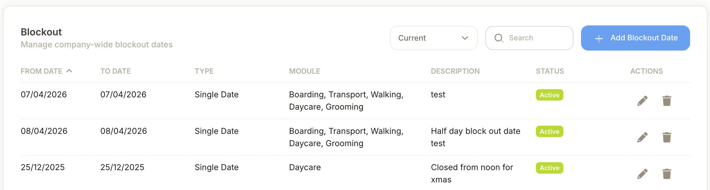 To set up Blockout Dates, go to Administration > Blockout Dates and select + Add Blockout Date.