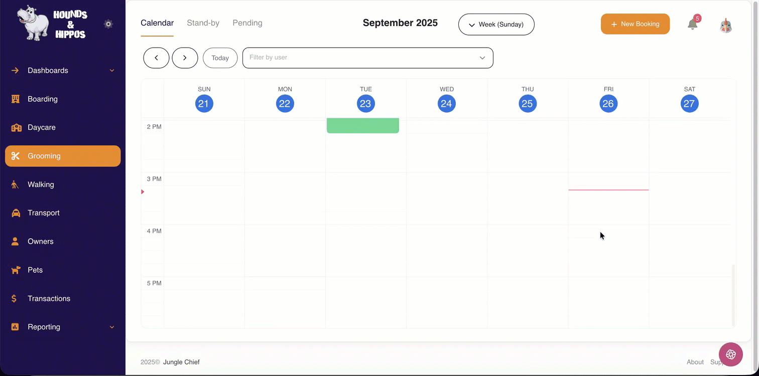 Drag & drop: Move a booking to a new time/groomer directly on the calendar.