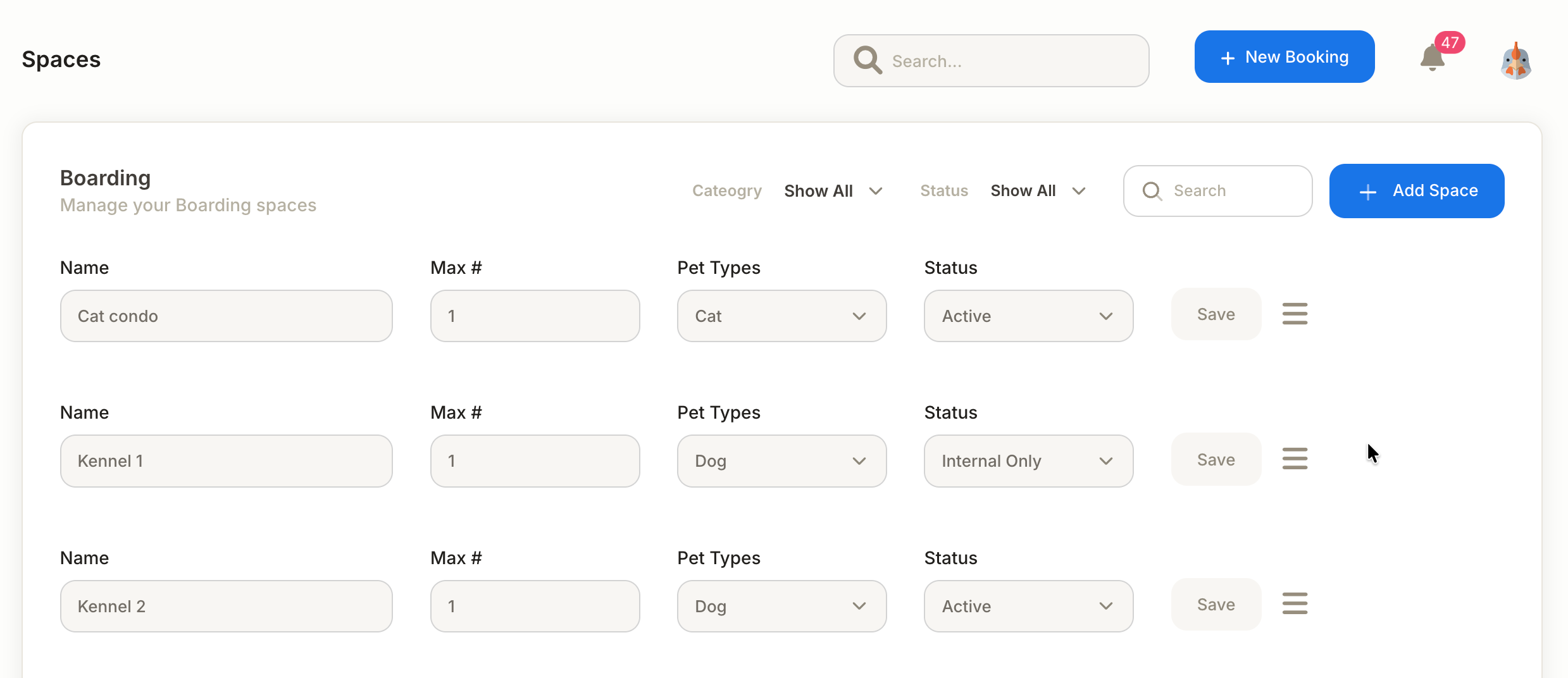 - Status: Internal Only or Active - for your reference only. Internal spaces do not count against towards your total occupancy. For example, if you have an Active space with 15 available spaces, and an Internal Space with 10 available spaces, your total bookable spaces will still be 15. The Internal spaces are there to allow you to move pets into specific area while being able to manually control your total occupancy.