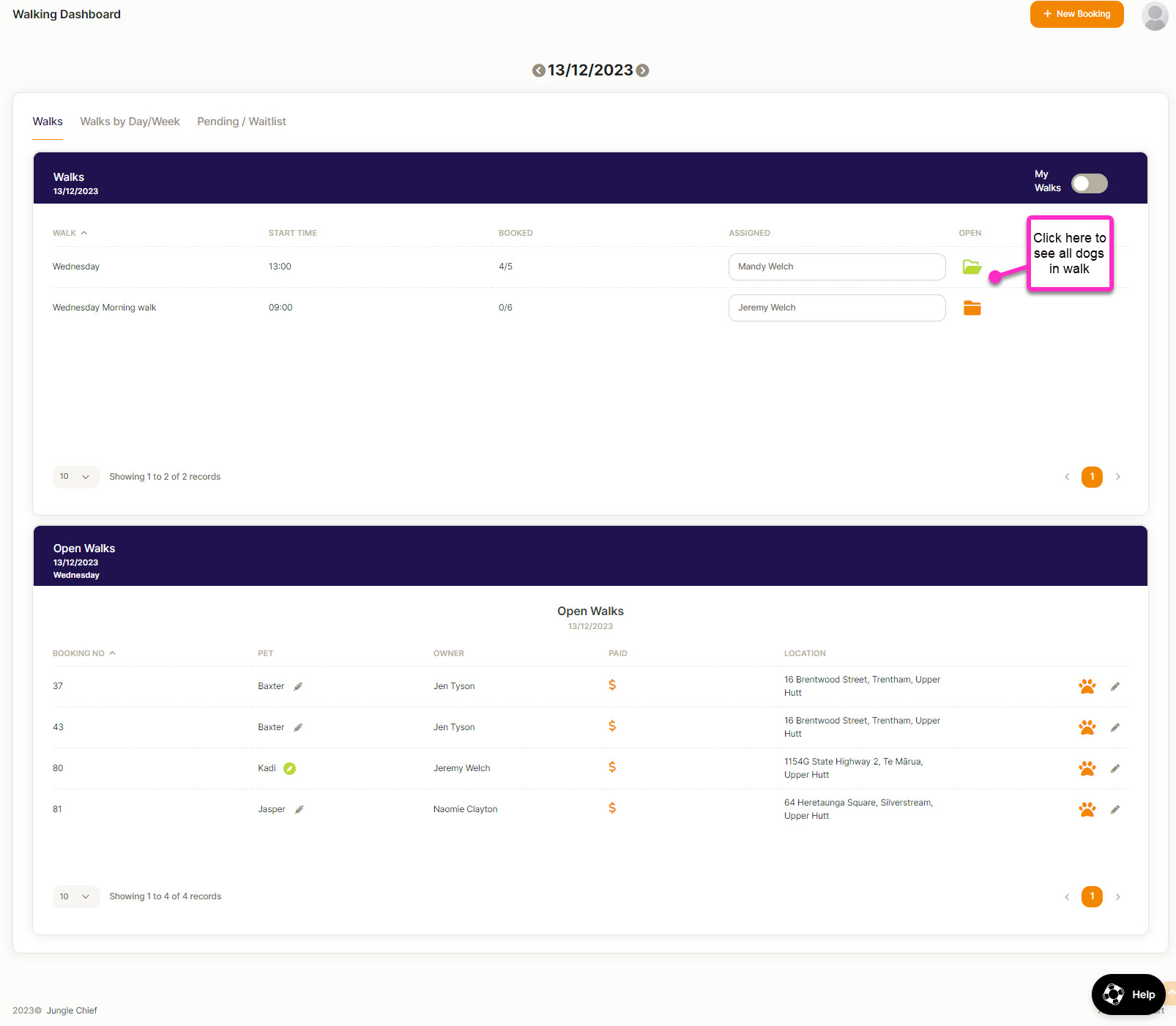 You can see the walks happening today, by clicking on the orange folder icon, it will open the walk and show it below in the open Walk area.